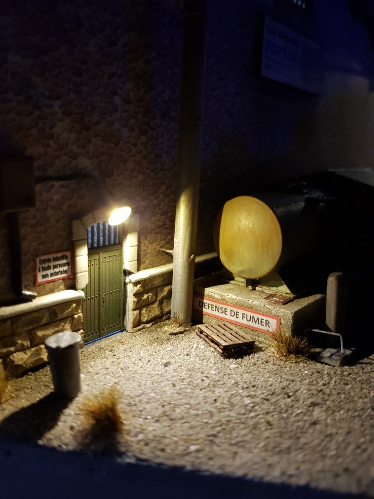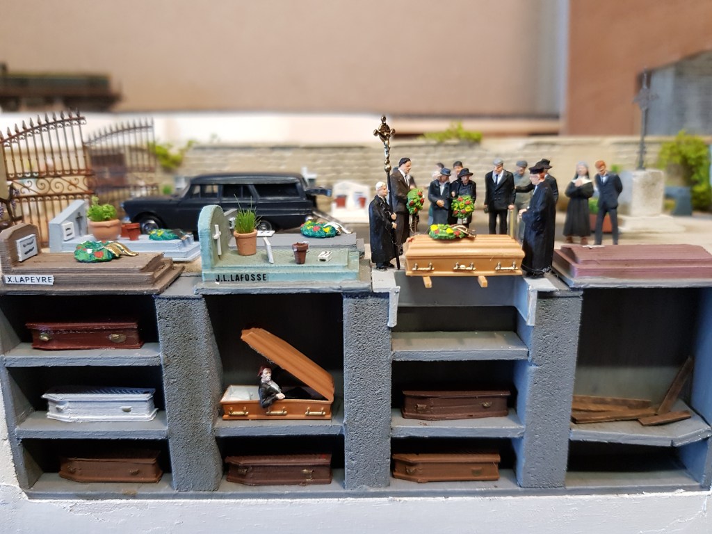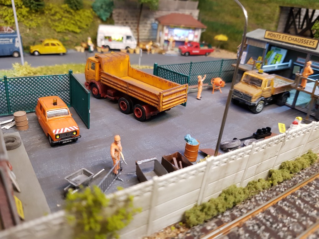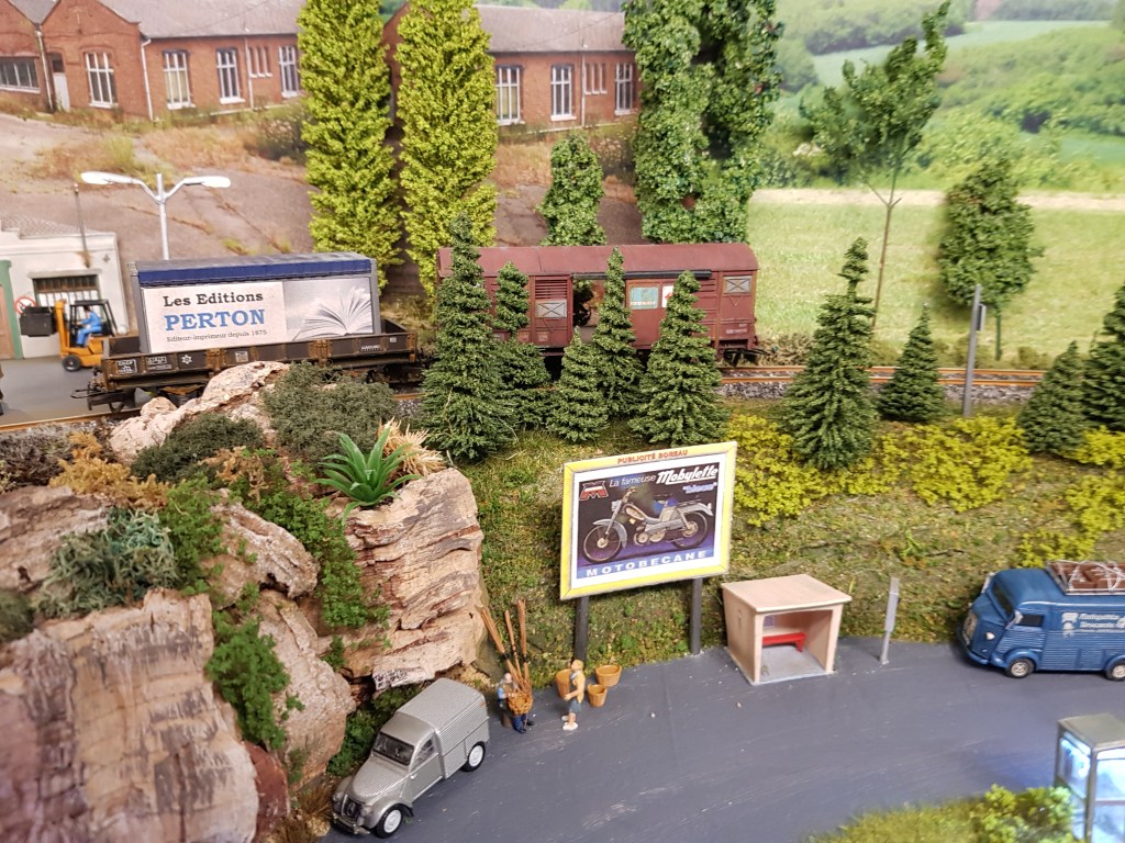 Le module « années 70 » représente une entrée de ville moyenne avec en premier plan, le cimetière en coupe, la maison du garde-barrière, en coupe également (maquette MKD), une route avec un dépôt des Ponts et Chaussées (Jouef et SAI) et un snack-friterie (Faller). En fond, une voie ferrée privée desservant l’imprimerie Perton (conception intégrale) en surélévation avec fonds de décor.
