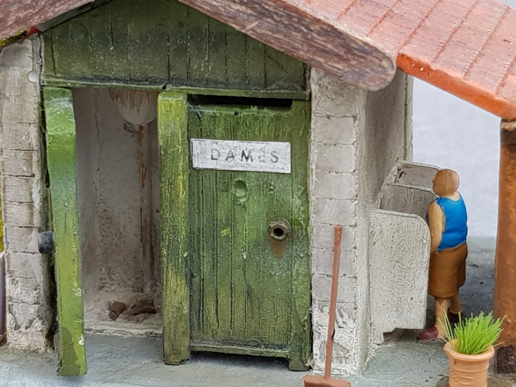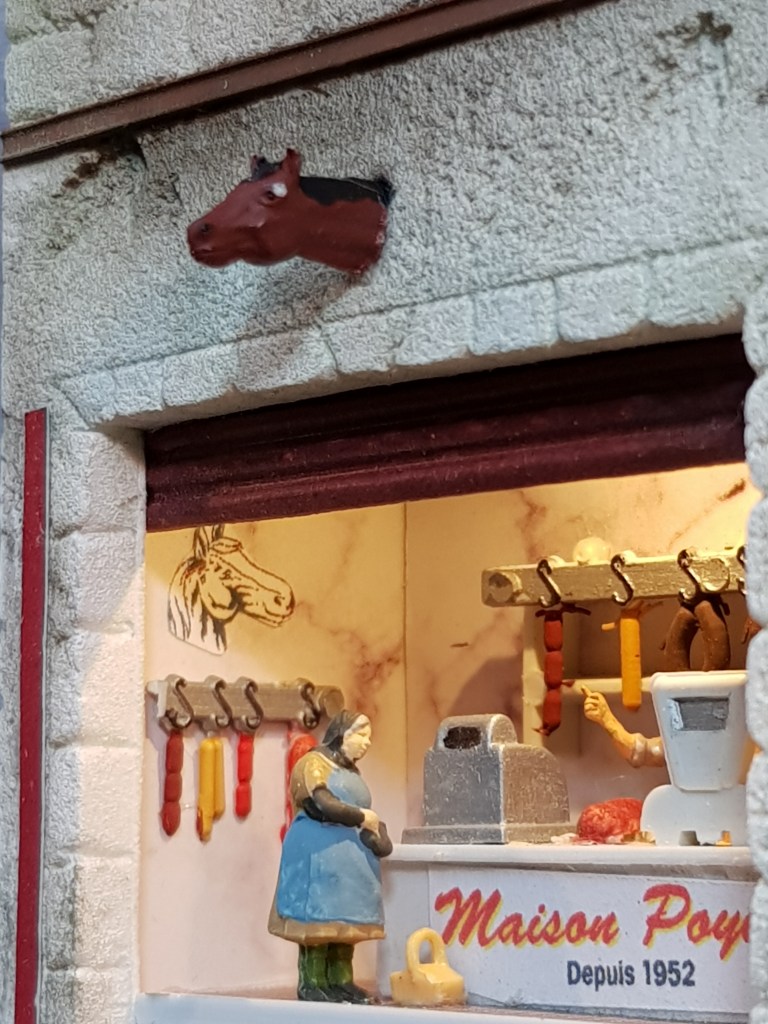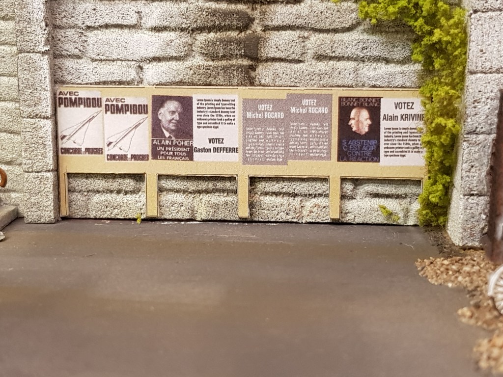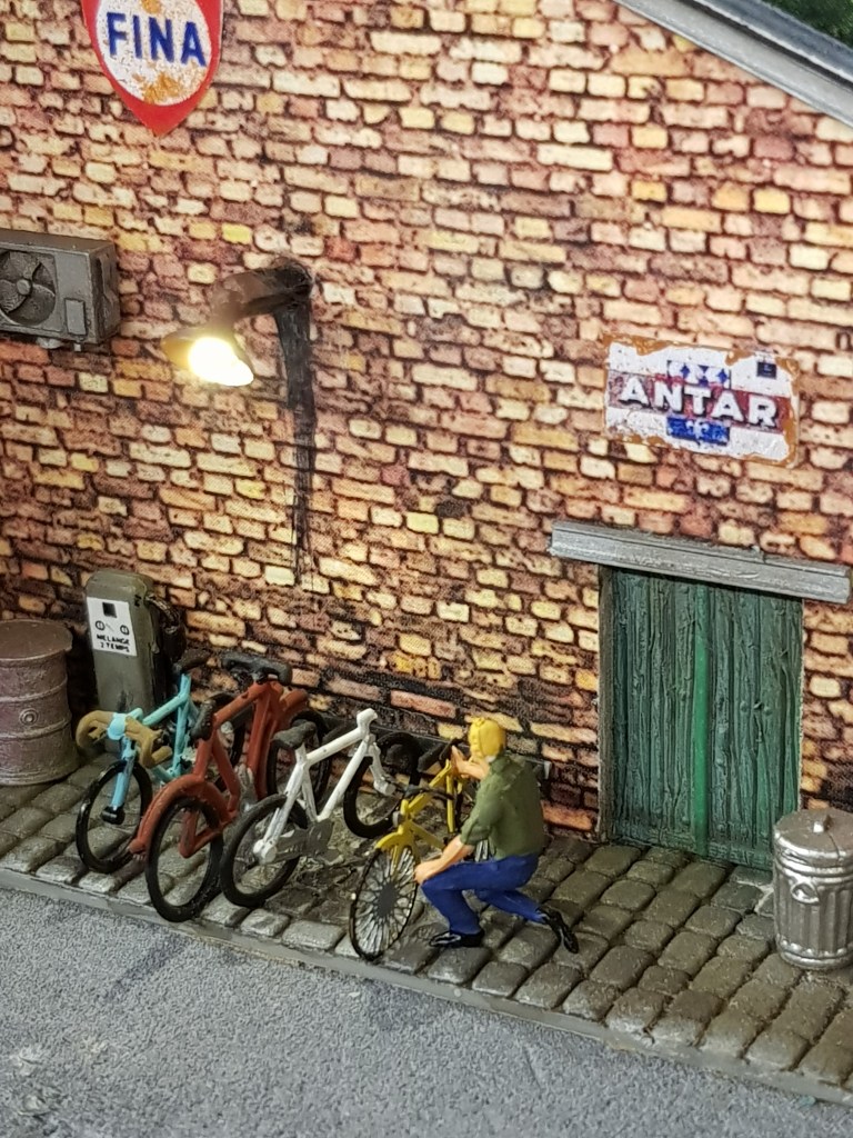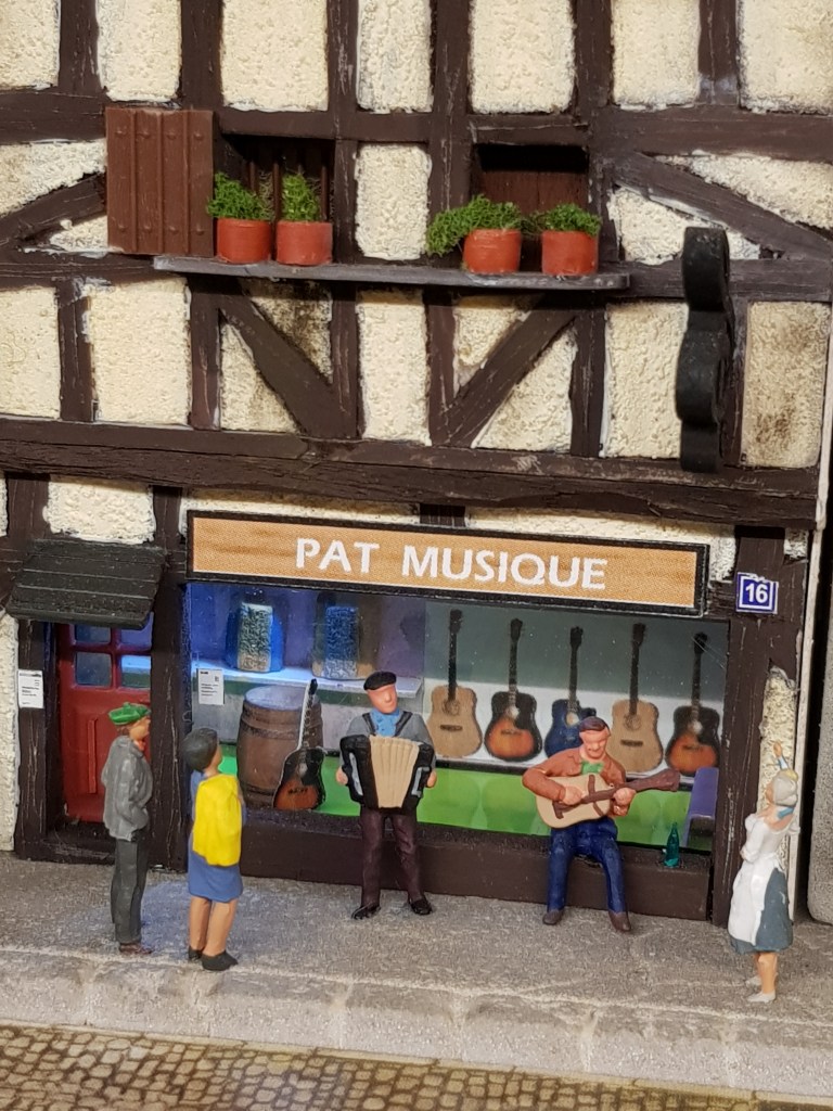 Une rue commerçante se place en surélévation sur le fond du module. Ce décor masque une voie ferroviaire cachée en pente qui donne accès au module « années 70 ».
