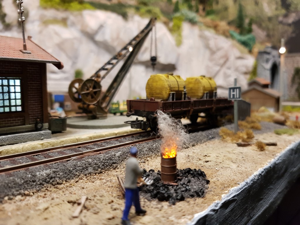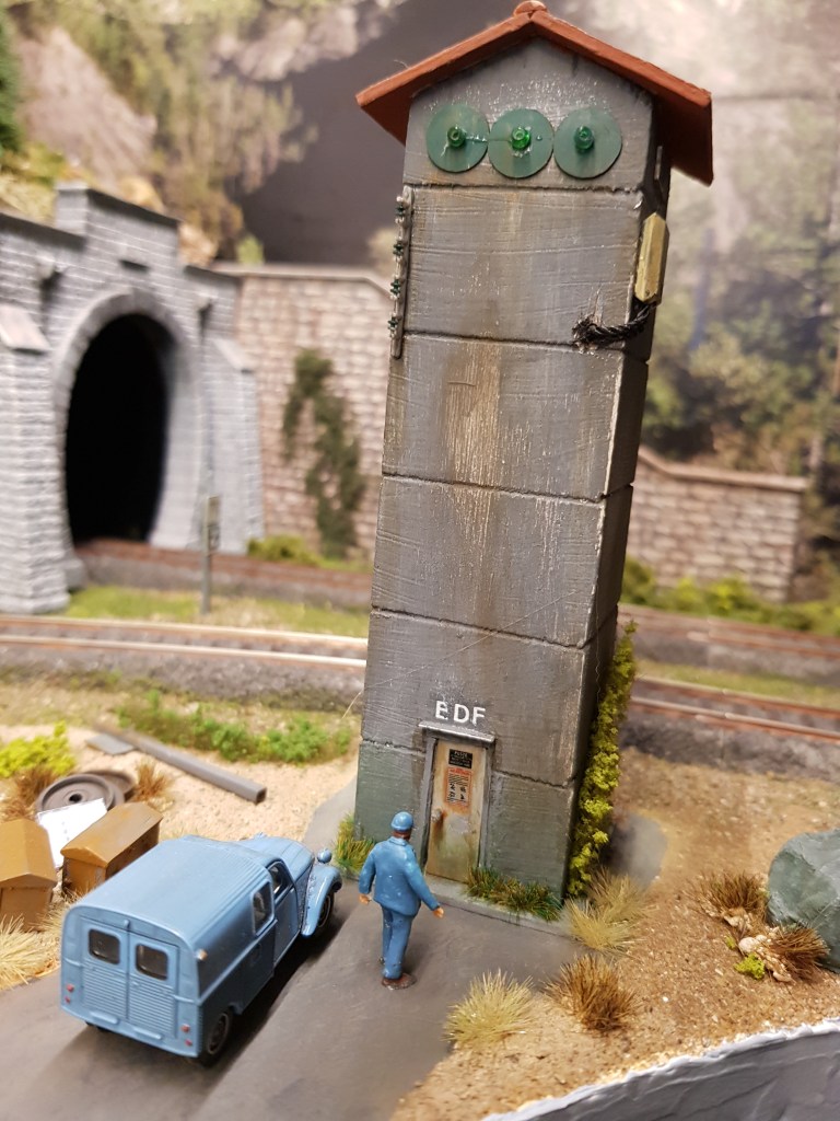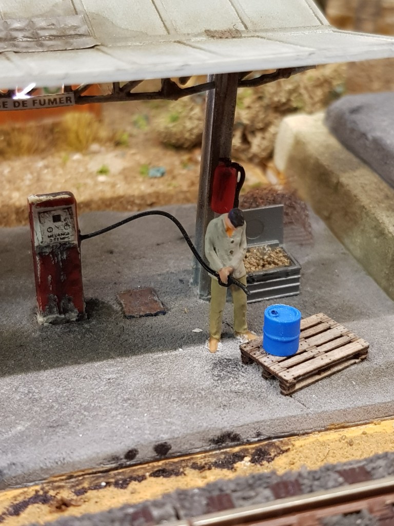 Le module « années 60 » représente la gare de Saint-Hervé-le-Château (maquette Artitec) en premier plan ainsi qu’une voie de service avec station de carburant (MKD), grue et bureaux (Jouef et MKD) et sa zone de stockage. N’oublions pas l’amicale bouliste de la SNCF située non loin (réalisation intégrale à partir d’un wagon couvert Jouef) !